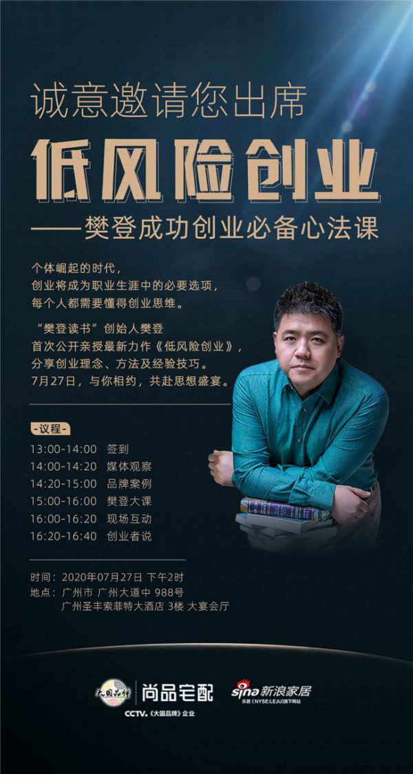 7月27日,由新浪家居、尚品宅配联合主办的“低风险创业”主题活动将在广州举行。樊登的“低风险”方法论在大家居行业是否同样适用?尚品宅配新模式如何构建企业持续发展的护城河?敬请期待!