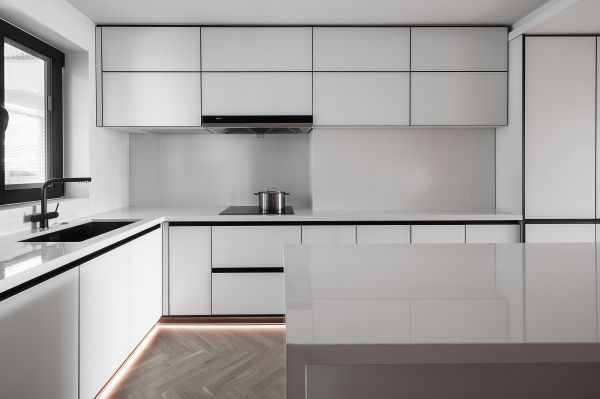 开放的厨房不仅仅增大了整体空间感,更让人感到舒适的生活节奏。基于业主的生活习惯与方式,白色柜面搭配黑色线条的高柜加低柜组合在满足丰富的收纳的同时,提升空间的清新舒适度。偶一抹·红融入这大片的白,成为灵魂的点睛之笔。