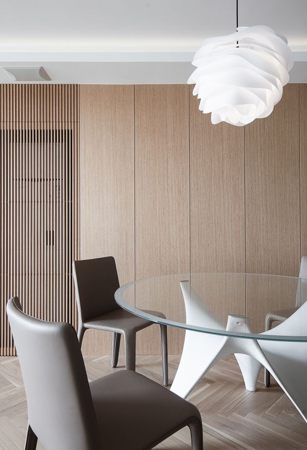 餐厅延续了整体的简约优雅,强调一种简练的高级感。花形吊灯优雅垂落于水泥浇筑和玻璃台面的餐桌之上,将餐厅简约到了极致,犹如一朵幸福之花,照亮这一方幸福天地。