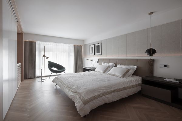 主卧以低饱和的木色为主,高饱和装饰营造空间质感。背景墙柔软的布纹肌理线条,为空间增添细腻灵动的情调。黑白装饰画和绿色沙发椅的点缀将空间的雅致气息愈演愈烈。
