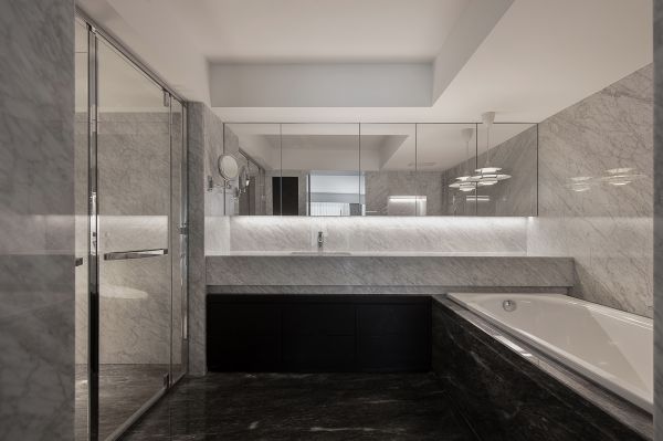 主卫同样延续简洁而充满张力的设计手法,在梁下保持原顶,做到最高,在卫浴设备选材上独具匠心,运用着大块的镜面及内部收纳空间保持一贯优雅,似乎身处其间就能褪去城市的喧嚣与烦恼。