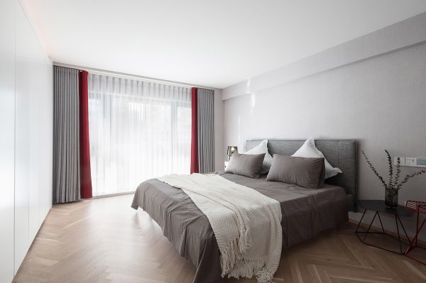 宽敞的落地窗前,灰色、红色窗帘兼顾安放好沉稳与跳跃,赋予空间更多的美学意味。灰色床品低调简单,却不显突兀,搭配黑红几案,让整个空间更具趣味感。