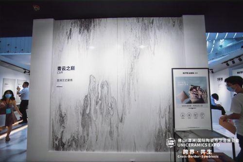 今年我们展厅主要展示的是江南园林景观,呈现“一步一景,以品做画”,主题是遇见江南。它是一个波峰为主基调来展示产品的独特味道的,比如说地面铺的是一款糖果釉拳头产品叫江南岸,还有另一款产品叫清平乐,都是江南风格的;包括青云之巅、奇境映画和金风玉露等系列,都是非常具有江南味道的产品,还有前面看到的一些连纹大板——云锦石,也都是紧扣着江南风主题的。希望今年我们带来的江南风系列产品,能为设计师带来一些新的设计元素,将设计注入到产品,用产品改变人居美学。