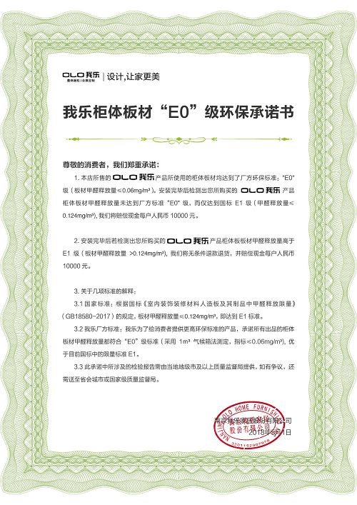 除此之外,我乐家居还会给购买者提供专属《我乐柜体板材“E0”级环保承诺书》,给用户双重保障,让用户放宽心,安心享受家居生活的美好。