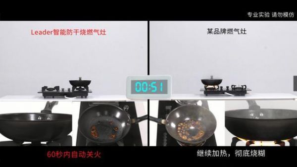 从视频中可以看出,Leader智能防干烧燃气灶能够自动检测锅底温度,达到警戒温度(290-320℃)时启动高温过热保护装置,自动切断燃气并发出报警音。并且在发生意外熄火时也能自动切断燃气通路,避免燃气大量泄漏,保护家用燃气安全。