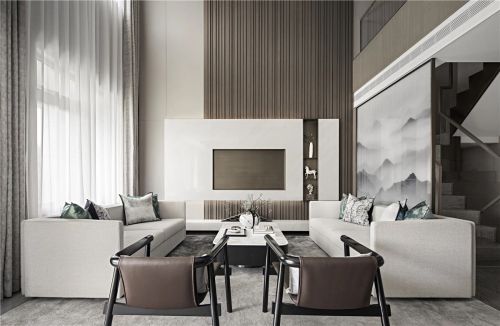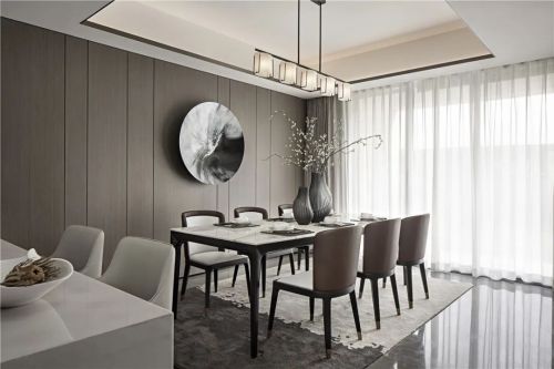 光影律动的木格栅,赋予了空间丰富的变化,给生活带来质感。而现代简约的家具,统一高级灰色调,搭配水墨氤氲艺术元素的介入,营造了洋房沉稳、宁静的空间气息。
