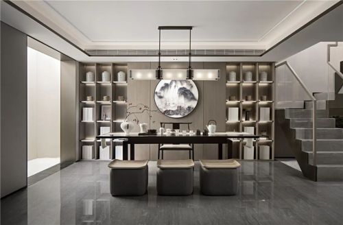 生活的本质是自由。而所谓自由,不是随心所欲,而是自我主宰。地下一层为居家休闲区域,设茶室与酒窖。居者亦可根据家庭结构、兴趣爱好,打造影音室、家庭图书馆、健身房等,让生活意趣在居住空间内得到延展。该空间层高有限,酒窖天花采用银镜,纵向空间被无限放大,配合光影的浮动,呈现了空间的高品质生活方式。