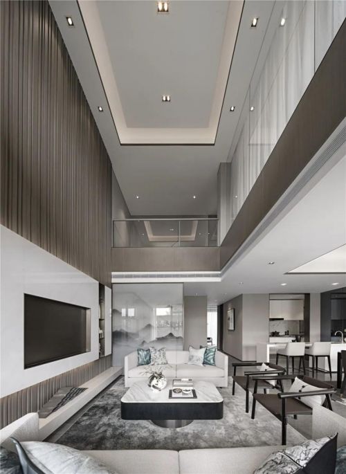 整体造型简洁,摒弃一切多余元素的赘述,通过细节材质的变化陈述空间,去表达一种不流于大同的审美意趣,回应着当下青年人群对文化的理解与认知。整个三层空间,最大特色在于首层与顶层为跃层设计,客厅挑空跳脱出单层扁平化的局限,这也是该户型的最大特色。设计希望强化这一挑空优势。因此立面梳理希望通过简化造型、元素统一等手法去放大空间的心理感受。