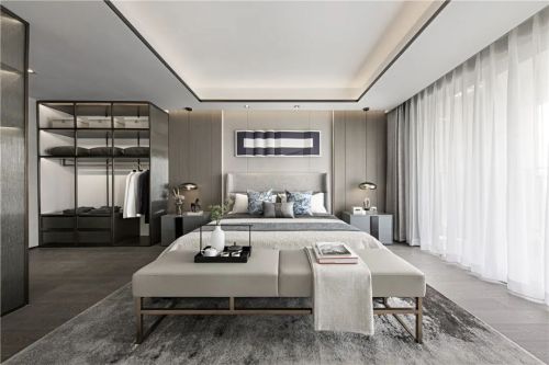 卧室作为休息的私享区域,顶层设主卧与次卧空间,静享安静、沉稳的独处时光。设计同样摒弃了浮华的装饰,以一种简约优雅的设计语言,及黑白灰三色的写意去呈现空间。 值得一提的是,主卧床头背景装置,醒目而具当代个性,彰显了富有质感的家居氛围。 次卧的设计手法更为凝练,一抹红提亮了空间的色调,明与暗的色彩对比,鲜明又利落。