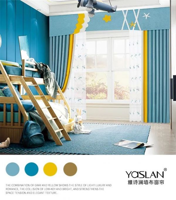 蓝色为主色的窗帘,加以明亮的黄色点缀,两者大胆又活泼的撞色,色彩明亮的环境对丰富儿童的想象力,促进儿童智力和眼部的发展都有很大帮助。