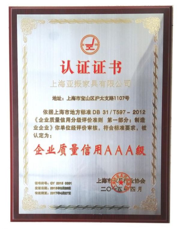 在28年的发展历程中,亚振始终坚持“追求极致 永无止境”的理念,为消费者提供高质量的产品与服务,企业于1999年在行业中率先通过ISO9001认证,现为中国家具协会副理事长单位、上海家具协会会长单位。亚振海派家具制作技艺被认定为上海市“非物质文化遗产”,凭借多年积累的品牌美誉及对海派家具制作技艺的传承,多次荣获“企业质量信用AAA级”、上海家具行业“名优产品”、上海市“五星级诚信创建单位”等荣誉称号。