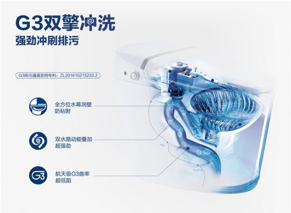 排污系统采用水幕润壁、冲吸双擎、G3曲率管道等多项创新技术,使虹吸时间缩短1倍以上,冲力倍增,管道阻力大幅度减小,冲刷排污强劲、彻底。