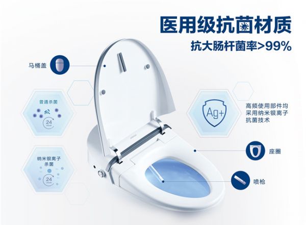 人体高频使用的马桶部件,如:座圈、喷枪喷头、马桶盖,均采用纳米银离子抗菌技术。游离的银离子直接进入细菌内部,使其失活致死,抗大肠杆菌率>99%,具有持续高效的抗菌效果。