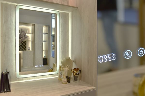 初看这面镜子感觉平平无奇,但仔细一看发现镜子下方还有其他信息显示。这面智能LED镜也是领尚衣帽间城市记忆的特色之一,在我们梳妆打扮、整理仪容时,镜子显示的时间、温度可以提醒我们的日程安排、增减衣物;而它的除雾功能更为人性化,即使遇上回南天也不用烦恼。
