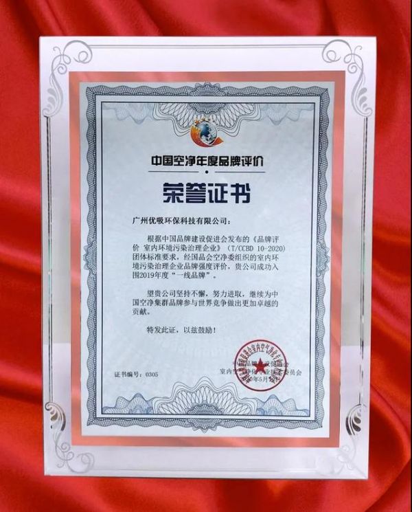 优吸环保荣获室内空气治理专业领域“一线品牌”称号!