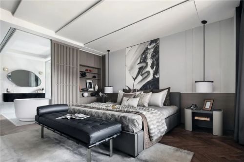 主人房既静谧又温馨,设计考虑独处空间的舒适,以低饱和度的灰与橙,呈现主人高雅的气度。