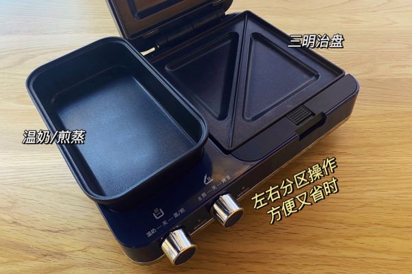 再来看它的控制区,它是设计了两个按钮,分区操作控制,使用的时候超级方便,哪怕只用一边也可以满足早餐需求。轻食区三明治盘、华夫饼盘的控制时间可以选择10分钟,但实测其实5分钟就差不多了。佐餐区在做煎蛋、温牛奶、蒸薯泥的时候,温度根据食材不同,达到一定热度,会自动断电,以此来满足不同的食材需求。