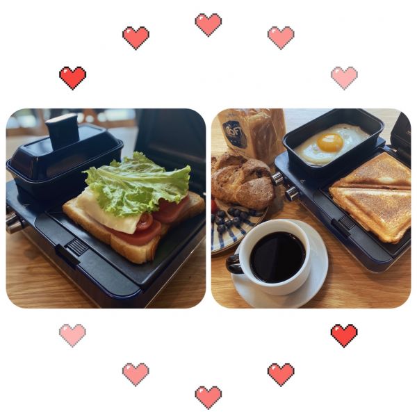 因为我是和朋友一块住,所以早餐一般都是双人份,这个双区域的设计正合适,特别节约时间。最常做的早餐就是快手三明治,先放上一片面包,中间加入想吃的蔬菜,还可以用小煎锅煎个鸡蛋、火腿片夹到中间,最上面再放上一片面包,合上盖子就可以了。我做的时候都没有放油,三明治也没有粘锅变糊。