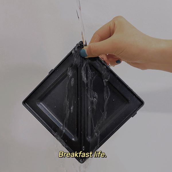 因为它——不粘锅!不管是小煎锅还是三明治盘、华夫饼盘,使用后先稍稍冷却,所有残留物用厨房专用纸轻轻一抹就擦掉了,还可以用清水直接冲洗,瞬间干净如新。这里要注意一点的是,要等机身完全冷却后再将烤盘卸离机身,避免烫手。