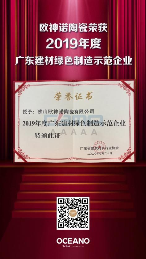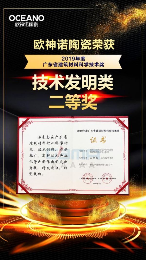 会上,欧神诺陶瓷并凭借扎实的研发实力、卓越的创新能力以及显著的陶瓷技术成果,从众多陶企中脱颖而出,一连荣获2019年广东建材绿色制造示范企业、2019年度广东陶瓷设计创新示范企业、2019年度"南玻杯"广东省建材行业技术革新奖、2019年度广东省建筑材料科学技术奖等五大奖项!