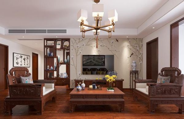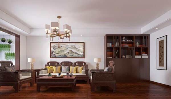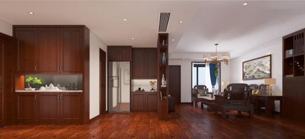 在家具材质上用实木与板面结合,与人接触的部分采用布艺软包增加舒适性,个别部位绣花仕女图布艺做点缀。深木色材质, 着力打造一个充满东方意境的空间。绘画为整个空间的一大亮点,以当代的实物绘画和油画为主彰显文化气息。简单到繁杂、从整体到局部,精雕细琢,镶花刻金都给人一丝不苟的印象。实木家具和地板的运用使客厅和餐厅的那种奢华、档次和品位毫无保留地流淌。