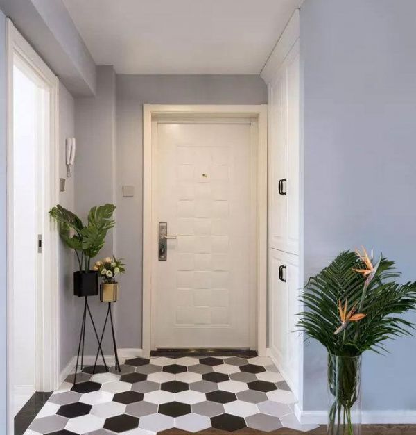 入户门是一个家的门面,也最容易表现自家的个性和品味。玄关有独立空间的,那么墙面效果也更容易表现。譬如用有颜色的乳胶漆,可以是浅色调或者重色调,也可以分成上下两部分来进行色彩对比出效果;六角砖也是一种很要个性的效果,同时还能区分玄关和其他空间的隔断。