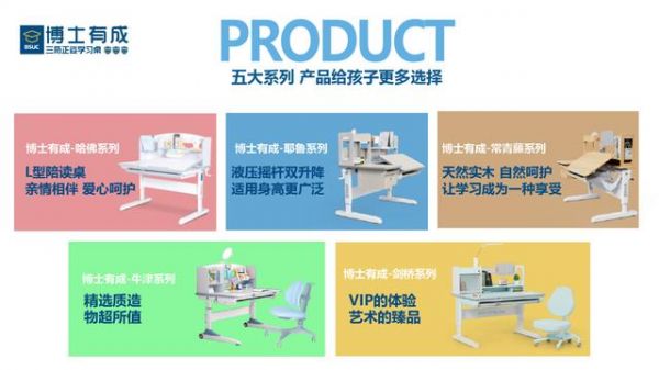 博士有成作为学习桌行业的知名品牌,高新技术企业,同时也是学习桌行业标准起草参与单位,以培养孩子正确坐姿为目标导向,研发出的"三防正姿学习系统"——防近视、防驼背、防毒害,为顾客提供高品质的舒适使用体验,更有牛津、剑桥、哈佛、常青藤、耶鲁五大系列学习桌产品,以及多款据人体工学研发的矫姿椅,全方位满足广大家庭对儿童学习桌的不同需求。