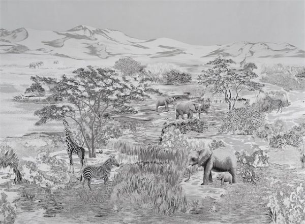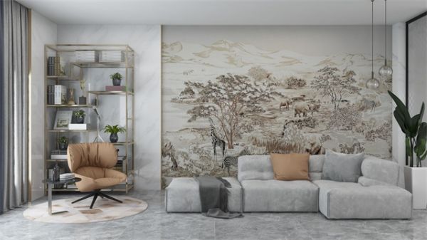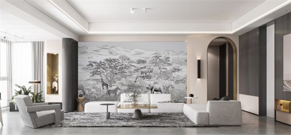墙布以灰色系作为主色调,采用高还原度的素描设计,很好搭配现代简约的家装风格。而且画面中的大象、长颈鹿和斑马都有很好的寓意,给家带来长长久久的平安、富贵与吉祥。