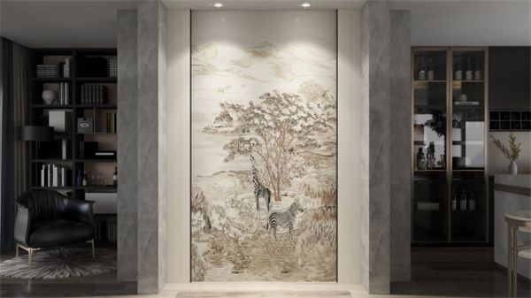 除了横向的背景墙,汇明A+墙布《梦想世界》还有玄关版本的。竖向截取的是画面左侧部分,悠闲自得的动物们,结合远处的群山,意境比较深远,尺寸上也更百搭。