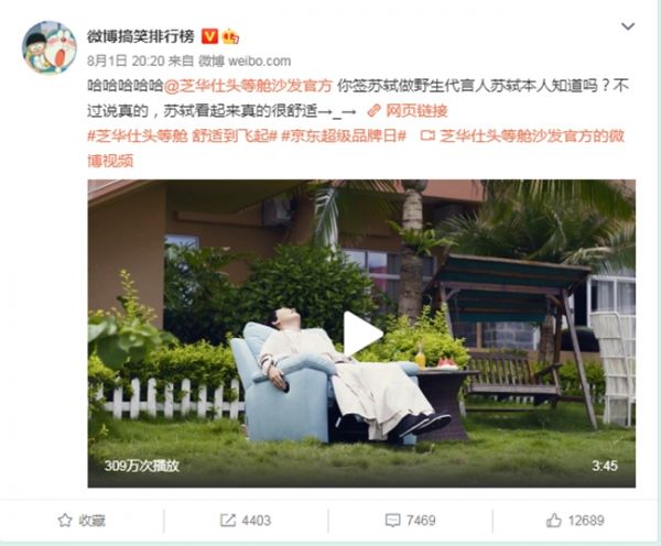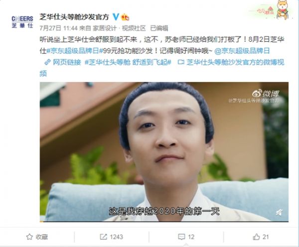 芝华仕京东超级品牌日期间,芝华仕推出了以网红“苏轼”为虚拟代言人,通过与芝华仕爆款单品契合的沙雕病毒视频,为用户带来创意且舒适的超级品牌日。此次项目通过深耕当红社交媒体微博进行营销传播,以#芝华仕头等舱 舒适到飞起#为话题,由头部微博红人—微博搞1笑排行榜等20余位 KOL在微博发起品牌营销,覆盖粉丝近1亿,为活动持续蓄水引流。通过魔性短视频让更多年轻人关注到芝华仕“舒适”的产品特性,以及为期将近一周的话题炒热,芝华仕京东超级品牌日话题#芝华仕头等舱 舒适到飞起#曝光量突破3000万,互动量超10万+,品牌tvc视频播放量超300万。
