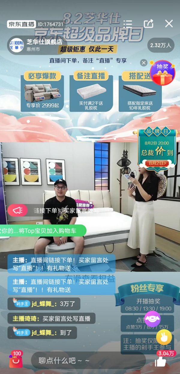 同时活动爆发期通过首次尝试京东总裁直播,邀请芝华仕总裁、京东家具事业部总经理以创意互动的形式进行品牌舒适直播,引导成交103.2万,直播观看量增长180%;引导进店浏览量39310次,超日均浏览量4倍;最高在线人数2000人,超日均直播20倍。通过站内外同步打造流量入口吸引消费者购买,最终达成营销闭环,促进流量转化,实现品效合一。