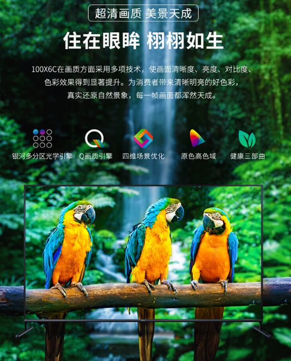 为了提升画面的真实感,它采用了四维场景优化、Q画质引擎、原色高色域和健康三部曲等。通过多项画质优化技术的多管齐下,使清晰度、亮度、色彩、对比度、色彩效果得到了显著提升。细致优化每一帧的画面细节,还原极具临场感的高品质影像。让你在追剧时可以看清每一个细节,沉浸在剧中无法自拔!