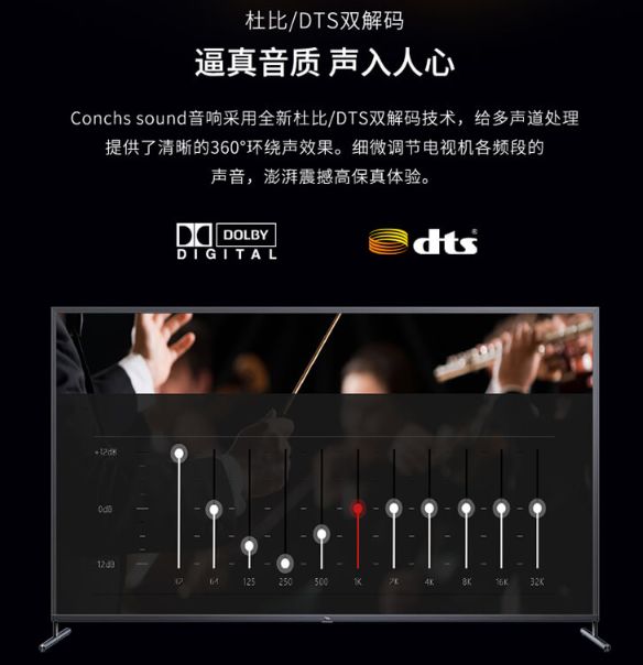 在音质方面,TCL 100X6C巨幕私人影院电视也是“天籁之音”——它搭载了一套Conchs Sound PRO音响,采用了业内顶级的全新杜比音效加DTS双解码技术。双解码音效技术,一方面让电视的声音更加保真,另外方面则是在纵向深度和横向宽度上进行了多维度多声道营造,为客厅创造了一个360°无死角的环绕音场,能让清晰的声流不断从四面八方奔涌而来,观影时让你如同身临其境,震撼十足。此外,内置的智能声响模式还优化了高频、低频下的声音失真问题,当声音有了丰富的韵律和层次感后,才能带来影院级的震撼音效。