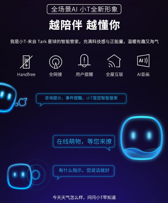 不仅如此,它还特别聪明。它可以实现24小时待命工作,开屏是大屏电视,息屏是智能音箱,能快速响应你的语音指令;除了这一点外,它还有自动匹配播放内容的"多角度识别技术"、根据每一步影片进行画面场景调节的"全能AI音画","全屋AI智能"还可以让它作为家庭的主管,直接控制家中的每一个智能电器,只需要呼唤一次AI助手“小T”,就能免唤醒持续进行对话命令,实在是太聪明了!