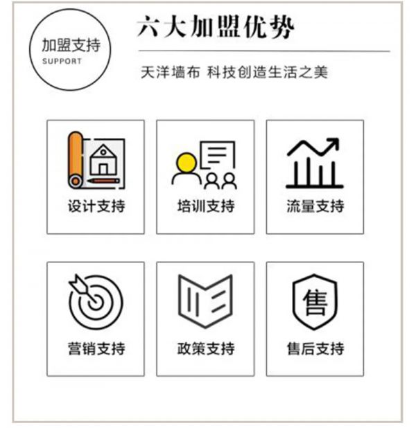 为合作伙伴创造价值是天洋墙布一直以来的经营理念。多年来,在企业经营中天洋墙布践行利他思维,持续为加盟商提供聚焦于“设计、培训、流量、营销、政策、售后”的6+赋能支持,不断推动在互惠互利中实现合作共赢,共建行业可持续发展的健康生态。