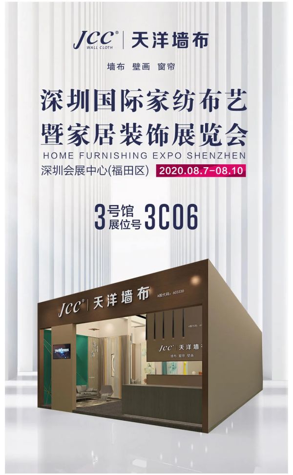 勇于开拓,博览共赢。2020年8月7日-10日,JCC天洋墙布,诚邀您莅临2020深圳国际家纺布艺暨家居装饰展览会3号馆3C06展台。共襄盛举,不见不散!