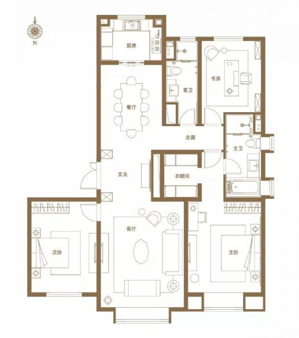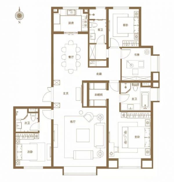 189㎡四居是166㎡格局的升级版,三卫的设计正好服务于四个卧室,即便是在高峰期也不存在排队的困扰。