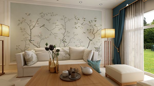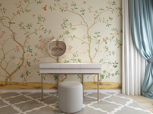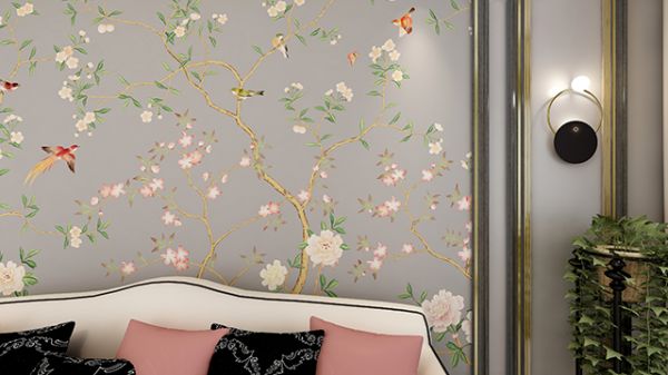 浅淡的色彩极尽春日里万物初初茁的清雅,每一朵花、一片羽毛、一根叶脉,都在细细对比后选择最适合的颜色,力求将色彩逐一过渡,利用光线明暗变幻之美创造出立体的层次美。点缀绣使鲜花与鸟雀成了整面独幅的吸睛点,主次分明,点亮整个空间。满绣则华丽高雅,处处皆是惊喜,充满视觉美感。