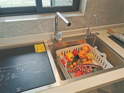 虽然占比面积不大,但厨房作为全家食物出品的重要空间,人性化动线设计和设备配置成为许多购房者考量的重要标准,也成为此轮装标升级中变化最明显的区域。抽油烟机、炉灶和消毒碗柜的三件套配置是一般精装项目常见的标配,近年随着生活品质提升,也有不少项目厨房装标配置了净水器、凉霸等,而现在,颐德湾尚、亚运城等项目的厨房配置能达到六件套,除了传统三件套,还包括厨余处理器、洗碗机、净水器。