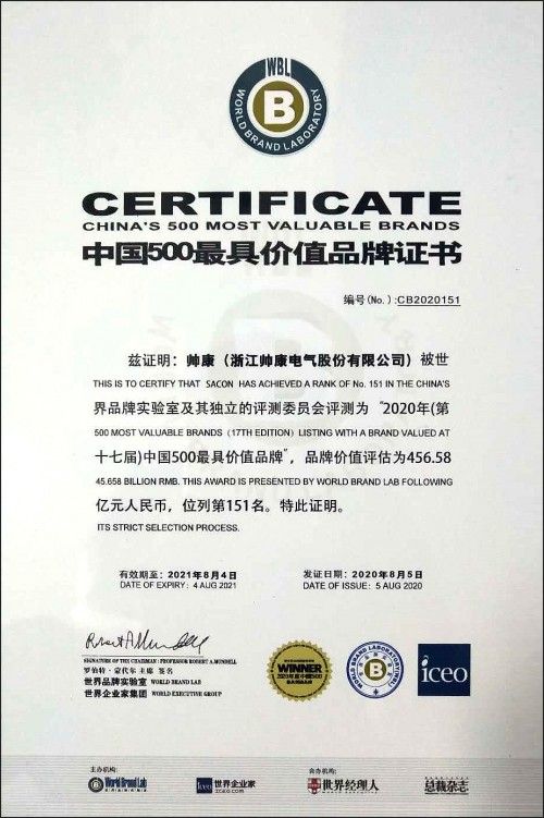 8月5日,由世界品牌实验室(World Brand Lab)主办的第十七届“世界品牌大会”在北京隆重举行,帅康电气总裁孙命阳受邀出席本次大会,会上发布了2020年《中国500最具价值品牌》分析报告。在这份基于财务数据、品牌强度和消费者行为分析的年度报告中,厨卫电器品牌帅康以高达456.58亿元的品牌价值荣登榜单,位列第151位,全面展现了帅康行业标杆品牌的雄厚实力。