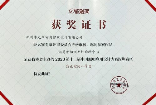 当晚,深圳赛区各大奖项一一揭晓,200多名行业精英一同见证了新一届照明设计的荣耀与辉煌。深圳市元本室内建筑设计有限公司打造的设计作品《南昌朝阳洲天虹购物中心》荣获祝融奖深圳赛区商业空间类金奖,将代表深圳参加全国总决赛。