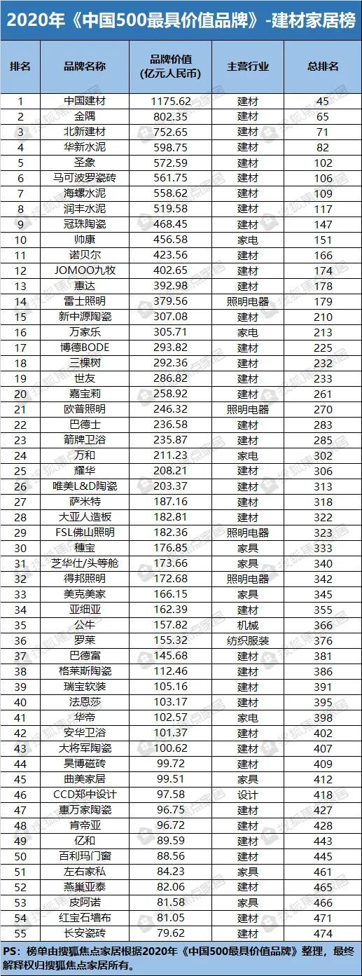 榜单前5分别是国家电网(品牌价值5036.87亿元)工商银行(品牌价值4505.82亿元)、海尔(品牌价值4286.52亿元)、腾讯(品牌价值4215.49亿元)、中国人寿(4158.61亿元);据搜狐焦点家居统计,包括北新建材、圣象、马可波罗瓷砖、冠珠陶瓷、帅康、诺贝尔、JOMOO九牧、曲美等在内,55家建材家居家电品牌入榜,覆盖陶卫、照明、涂料、软装、家具、厨电、设计等多个领域。聚焦泛家居产业,搜狐焦点家居特别整理2020年《中国500最具价值品牌》-家居榜。建材品牌共39个,其中,中国建材以1175.62亿元的品牌价值高居榜首,CCD郑中设计作为一家设计机构入榜,品牌价值为97.58亿元。值得关注的是,一些在零售端为消费者所熟知的品牌,诸如曲美、九牧、左右、芝华仕、公牛、华帝等也入榜。
