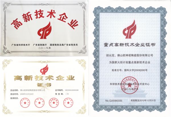 在研发创新上,欧神诺目前拥有有效专利134项,其中发明专利30项、外观设计专利66项、实用新型专利16项、科技成果鉴定22项。并且先后获国家火炬计划重点高新技术企业、国家知识产权优势企业等20多个国家级称号。