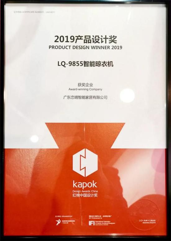 2017-2020年,恋晴“声控智能晾衣机”“高端智能晾衣机”被认定为广东省高新技术产品,获得高新技术产品荣誉证书。智能晾衣机LQ-9855于外观设计创新,2019年实力荣获中国红棉产品设计奖项,对企业产品理念有进一步影响提升。