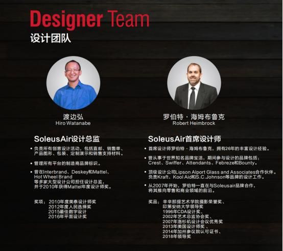SoleusAir舒乐氏拥有国际顶级设计师团队,其中,SoleusAir设计总监渡边弘负责所有创意设计活动,包括直邮、销售单、 产品图形、包装、定制演示和销售支持材料。SoleusAir首席设计师罗伯特·海姆布鲁克,拥有26年的丰富设计经验。从2007年开始,罗伯特一直在与SoleusAir舒乐氏品牌合作,将其推向零售和商业领域的前沿。