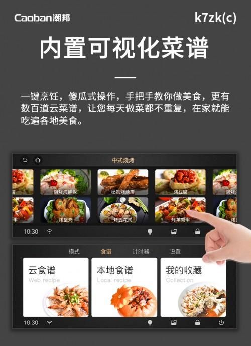 潮邦K7zk(c)的蒸烤一体集成灶内嵌400+云食谱,提供专业烹饪建议,网罗八大菜系、中西料理。你决定吃什么,潮邦解决怎么做,让你轻松坐享健康美食。