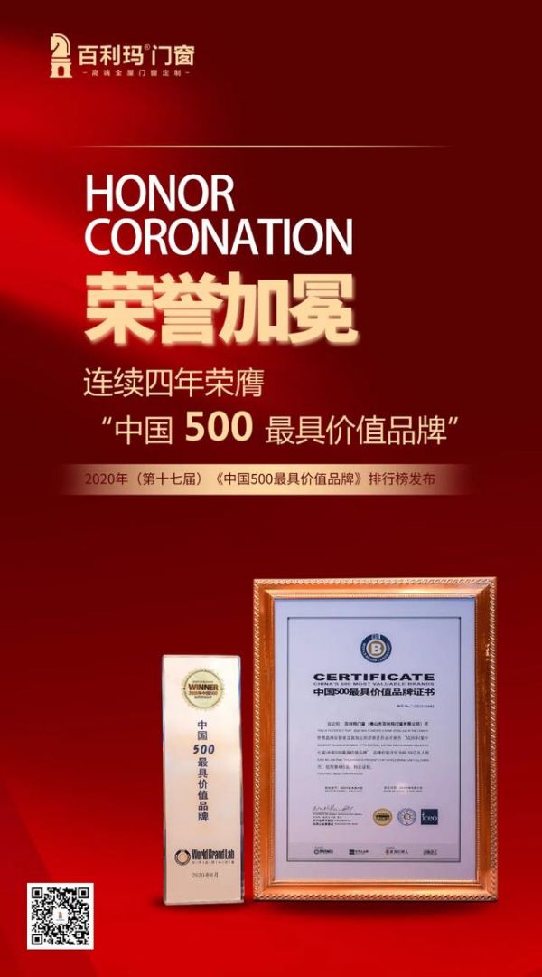 8月5日下午,由世界品牌实验室(WBL)主办的2020年(第十七届)“世界品牌大会暨中国500最具价值品牌发布会”在北京隆重举行。会上发布了2020年“中国500最具价值品牌”排行榜。在这份基于财务数据、品牌强度和消费者行为分析的年度报告中,百利玛门窗2020年度以88.56亿元的品牌价值评估荣列榜中,连续四年荣获“中国500最具价值品牌”!