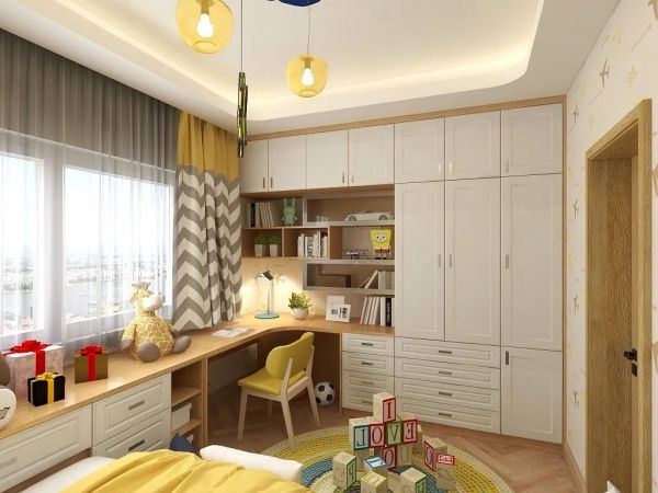原木+白色,舒服的色调,飘窗柜+书桌+书柜+衣柜的一体式设计,整面的柜子设计,满足四季衣物的收纳,飘窗抽屉设计可以完美收纳小物件和日常玩具,书桌又很好解决学习场地问题,学习辅导也不会显得拥挤。
