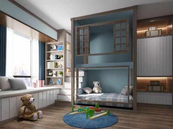 对于二胎家庭而言,上下铺的设计既可以很好解决居住空间问题,柜子解决收纳,明亮调动的颜色符合小孩子的活泼天性,本以为新中式的儿童房设计或过于呆板,但看到图片后感觉好不错,如果家中整体装修为新中式的,可以尝试。