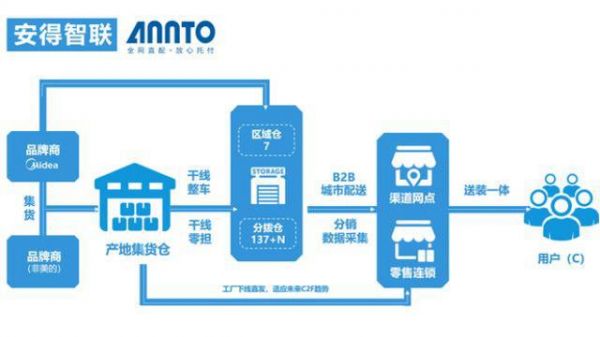 早在2015年,安得智联便承接美的集团T+3一盘货战略。美的集团在全国各营销中心、代理商、分销商的仓库与库存,均由安得进行统一的管理、配送。期间,安得打破原有渠道多个节点层层分拨的模式,逐渐打造出更符合制造业发展痛点F2B2b2c仓配网络。